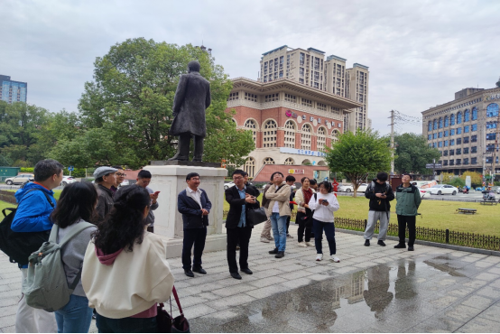 一路上,有四位老师承担了解说任务。在八路军驻湘通讯处旧址附近,王昕伟老师作了简要的介绍。通讯处成立后,积极宣传党的抗日主张,吸收革命青年奔赴抗日前线,向抗日前线转运通讯器材和医药用品。不远处的国货陈列馆,是旧长沙的标志性建筑和长沙商业文化的象征。90多年前,以“抵制洋货”、“产业救国”为使命的它诞生在了这里,而后又幸运地逃过了“文夕大火”得以留存至今。大家不时驻足,放慢脚步,认真倾听,一起回眸那段革命岁月。
