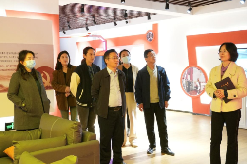 来宾一行首先参观考察学院新建的大思政课实训中心及大思政课实践教育平台。郭鹏飞主任向来宾介绍学院实验室的建设情况。双方观看习近平考察湖南专题虚拟现实展览馆,就大思政实训中心的虚拟仿真教学功能,虚拟现实备课系统展开深入交流,在讲解员协助下体验图书长廊、AR/VR虚拟现实教学功能和效果。