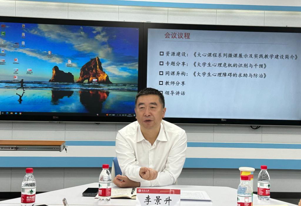 李景升副书记评价这是一次高质量的备课会。他指出《大学生心理健康教育》课程的重要性和主要任务,强调课程的教学工作要能帮助学生提升心理能力,面对心理困境,知道如何求助和帮助他人;要能充分体现和融入课程思政元素。李书记指出,讲好这门课,是个功德无量的大事情,老师们应该清楚:自己的责任在哪里,如何增强专业能力,如何寻求专业水平提升的支持系统,如何提高感染力与亲和力,如何在师生交往过程中发现学生的问题和困难。他希望老师们要让学生深刻意识到自己身上的家庭责任与社会责任,要帮助学生应对求助意识不强、家校联动不够的常见问题。