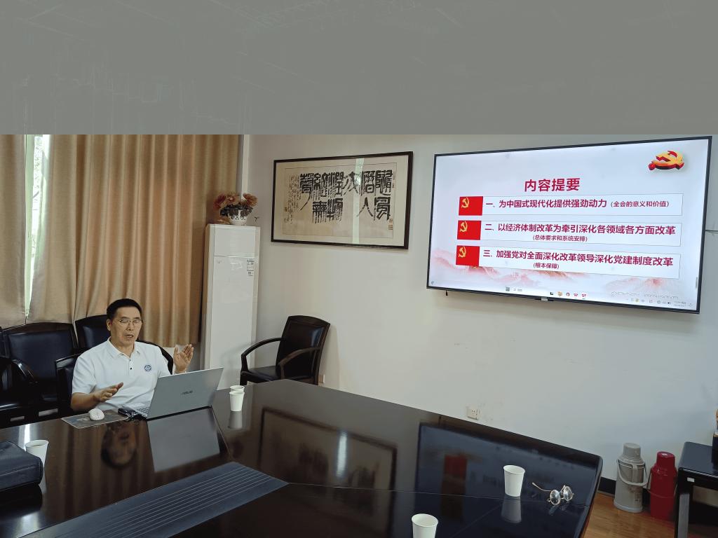 这次会议有三个议程。第一个议程,由马院老龄委员、副院长胡晓副教授做关于党的二十届三中全会精神宣讲报告。第二个议程,由刘新庚教授做关于党的二十届三中全会精神的解读报告。第三个议程,由支部书记孙梦云组织大家围绕三中全会精神展开讨论。讨论的题目是:结合自身实际,谈谈你对我国全面深化改革、推进中国式现代化的学习体会。