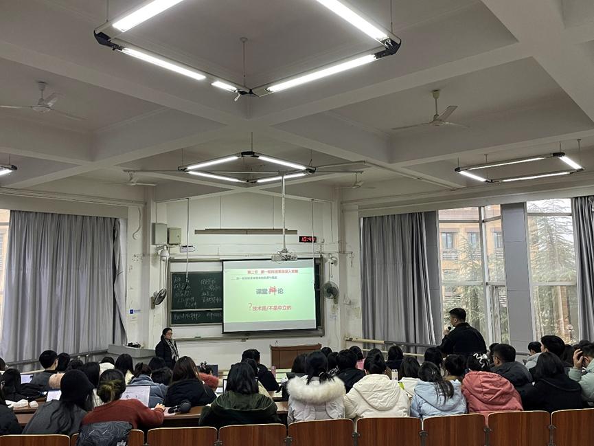 2023年12月15日上午,研究生思政课教研中心在湘雅新校区T306教室开展了本学期博士研究生《中国马克思主义与当代》课程公开课教研活动。公开课由姜芳蕊老师主讲,主题为“当代科学技术”。学院胡栋材副院长和数名老师参与听课评课活动。