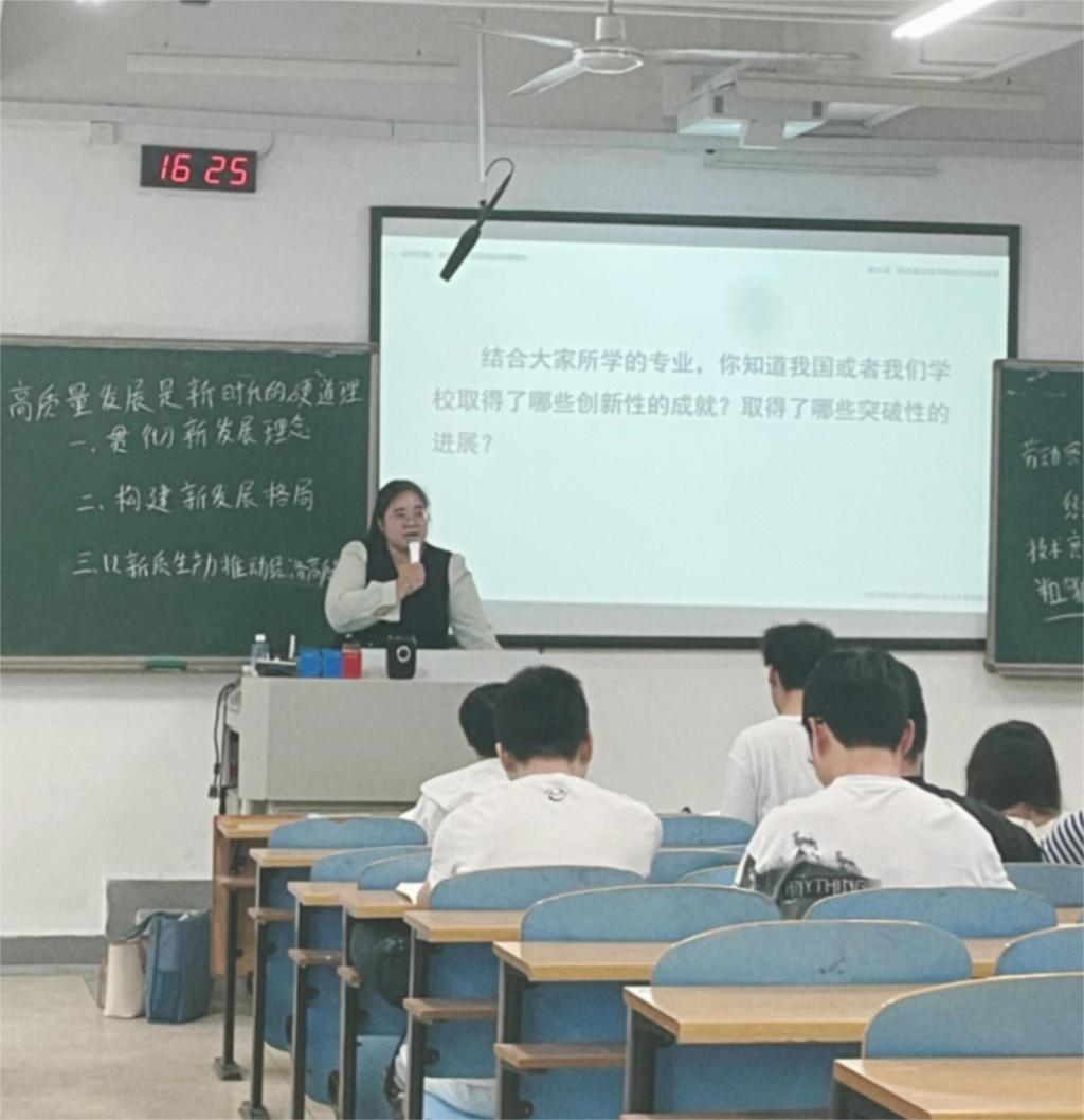 闫老师授课娓娓道来,一是问题意识突出,聚焦“高质量发展是新时代的硬道理”这一主题,以“外贸出口新变化”的生动案例导入,引出本堂课的核心关键词“高质量发展”,充分调动起学生的学习兴趣。并且围绕“贯彻新发展理念”“构建新发展格局”“以新质生产力推动经济高质量发展”三个方面阐述如何引领高质量发展这一重要问题,厘清三者与高质量发展的内在逻辑和关联。二是内容具有广度和深度,闫老师选取“外贸老三样到新三样转变”“新能源汽车产能是否过剩”等诸多鲜活案例支撑论点,并且通过自身扎实的理论素养讲清楚诸多专业名词的概念和内涵,极大提升课堂的理论深度。